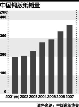 中國(guó)造紙協(xié)會(huì)調(diào)查資料顯示,2000~2007年,全國(guó)紙及紙板消費(fèi)量年均增長(zhǎng)10.72%,高于同期我國(guó)GDP增長(zhǎng),是全球紙張消費(fèi)第二大國(guó),僅次于美國(guó)。十幾年來(lái),世界紙品消費(fèi)量年均增幅僅為2%~3%。在銅版紙市場(chǎng),從2000年以來(lái),國(guó)內(nèi)消費(fèi)量遞增10%,同時(shí)凈出口額也在逐年遞增。