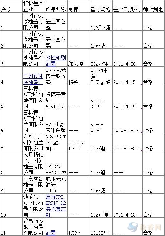 2011年廣州市油墨質量監(jiān)督抽查產品及其企業(yè)名單