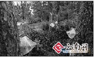 根據(jù)工作人員的指點(diǎn),記者終于找到了雞冠山村,徒步走到了位于村后山上的松樹(shù)林。遠(yuǎn)遠(yuǎn)看去,松林十分粗壯茂盛,平均高度至少有十多米。隨著往里走,記者發(fā)現(xiàn)沿路不少松樹(shù)都被人割了皮,傷口呈Y字形,“Y”字形開(kāi)口處寬度至少有二三十厘米,外層表皮已沒(méi)有了,露出了白色的內(nèi)層。在表皮被刮開(kāi)的部分,自下而上被割開(kāi)了幾條溝,一條比一條割得深。而在溝下面則掛有一只透明的塑料袋,袋子兩邊用木釘緊緊釘在樹(shù)上,袋口內(nèi)側(cè)嵌在割開(kāi)的樹(shù)里,這樣的樹(shù)木僅在雞冠山村這個(gè)方向保守估計(jì)也有幾千棵。