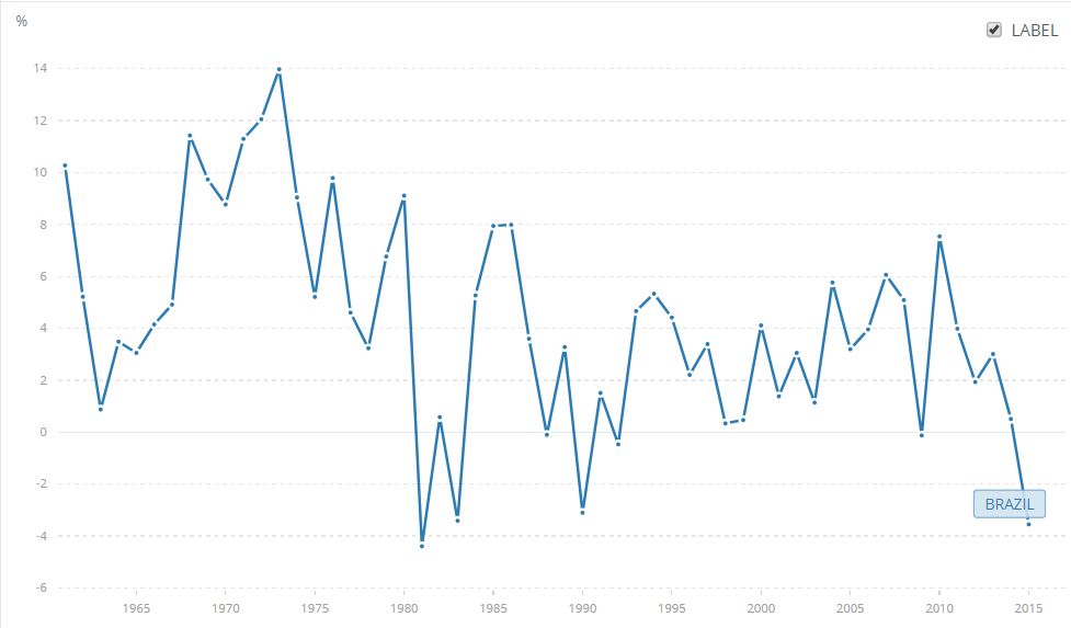 隨后,在工業(yè)化的推動(dòng)下,巴西在1948€€1979年期間,GDP平均增長(zhǎng)率達(dá)7.2%,其中,1968€€1973年期間,更取得了10%以上的高速增長(zhǎng),被稱為“巴西奇跡”。