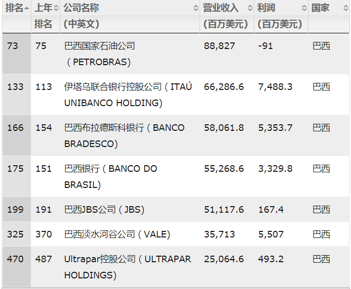 更直觀的反映是,在2018年福布斯世界企業(yè)500強(qiáng)中,巴西一共入圍7家,從名字就能看出來(lái)2-4位是金融企業(yè)。剩下的里面,巴西國(guó)家石油公司和Ultrapar控股公司,一個(gè)主業(yè)是石油,一個(gè)是天然氣,JBS是肉食加工企業(yè),淡水河谷是鐵礦石生產(chǎn)和出口商。
