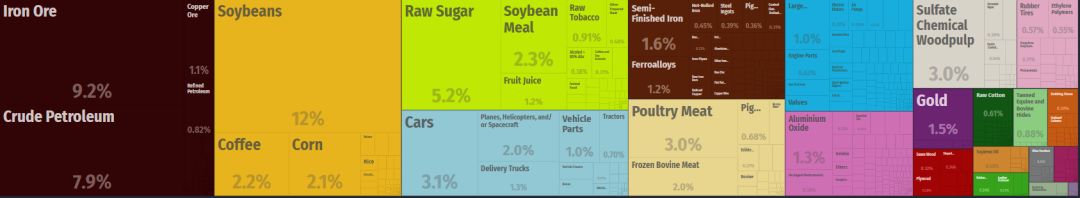 比如,前面說(shuō)過的巴西淡水河谷是全球最大鐵礦石出口商,。巴西還是全球最大的咖啡、牛肉、蔗糖、雞肉出口國(guó)。