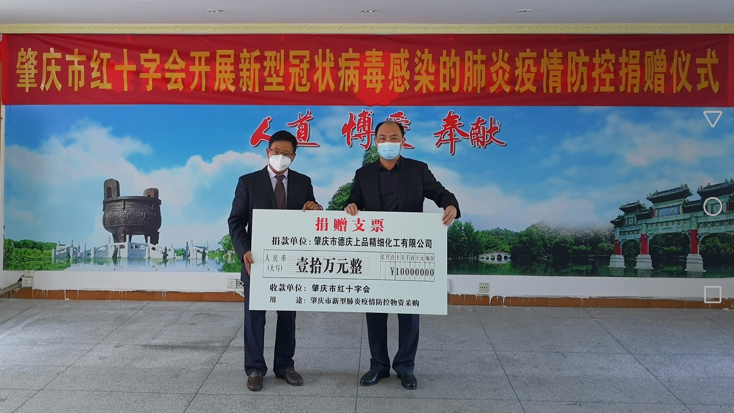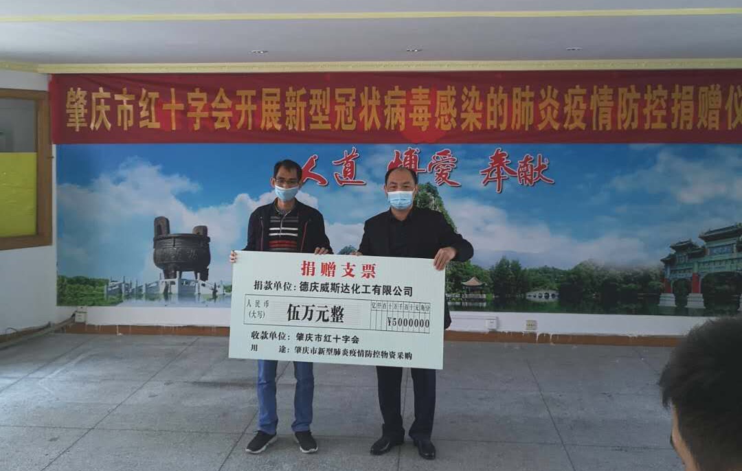 肇慶市德慶上品精細化工有限公司及總經(jīng)理周啟斌本人 現(xiàn)金捐贈38萬元,消毒液和口罩超16萬元,