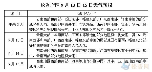 華訊松香網(wǎng)溫馨提醒:未來三天,兩廣、云南、福建、江西等地降雨范圍有所擴大,其中廣西西南部、廣東、云南大部、福建東部等地區(qū)有中到大雨或暴雨。氣溫方面,受較強冷空氣影響,江南大部將出現(xiàn)4-6℃的降溫,晝夜溫差較前加大。另今年第16號強熱帶風(fēng)暴“三巴”于9月12日20時加強為臺風(fēng),未來2天對我國暫無影響。本周,江西、福建、云南等產(chǎn)區(qū)松脂量較前有不同程度增加,但整體脂量較往年同期仍偏少。隨著降雨降溫天氣的來臨,后期松脂量能否持續(xù)釋放仍有待觀察。