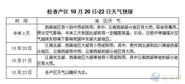 華訊松香網(wǎng)提醒:未來三天松香產(chǎn)區(qū)除了云南部分地區(qū)有降雨之外,其他地區(qū)天氣變化不大。值得關(guān)注的是,將有一股強(qiáng)冷空氣影響我國北部,之后會(huì)東移南下影響我國中東部大部分地區(qū),屆時(shí)或?qū)⒂绊懡?、福建等產(chǎn)區(qū)最后一批松脂的下山。