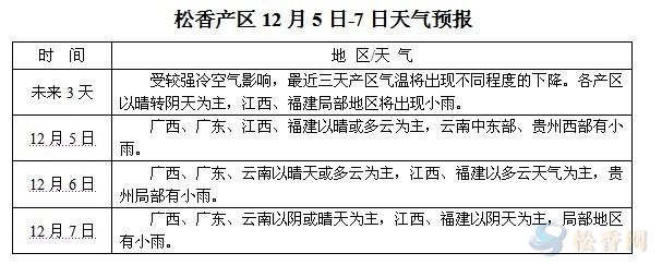 華訊松香網(wǎng)提醒:受較強(qiáng)冷空氣影響,未來三天,各產(chǎn)區(qū)均不同程度的降溫。各產(chǎn)區(qū)以多云天氣為主,降溫與陰天將對松脂出油量產(chǎn)生影響,仍在上山采脂的脂農(nóng)請注意天氣變化,合理安排采收。