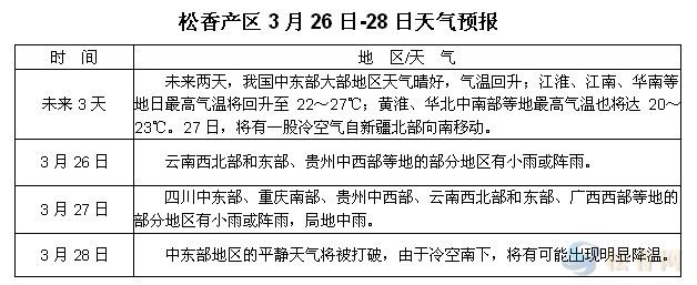 華訊松香網溫馨提示:未來三天,中東部大部地區(qū)天氣晴好,兩廣、江西、福建等地氣溫回升明顯,有利于上山作業(yè),各產區(qū)注意把握好時間開展前期采脂準備工作。云南局部地區(qū)有小雨,但降水基本保持稀少的格局。