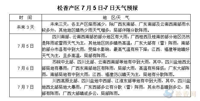 華訊松香網溫馨提醒:未來三天,各主產區(qū)降雨減少,以多云或晴熱少雨天氣為主,利于進行松脂采收工作,隨著天氣轉晴,采脂工作恢復正常,部分產區(qū)松脂量較前兩日有所增多。另江南大部、華南北部等地維持35℃以上高溫天氣,江南中東部的部分地區(qū)可達37~38℃,上山人員需注意安排工作時間避免中暑。