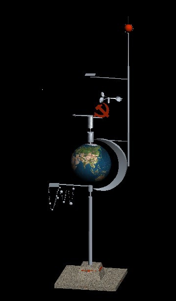 在采訪中,潘永鑫還提了一件令其興奮的事情。去年,在改革開(kāi)放30年的日子里,他加入了中國(guó)共產(chǎn)黨,成為一名黨員。作為表達(dá)對(duì)黨的忠誠(chéng)及改革開(kāi)放30年的獻(xiàn)禮,他特設(shè)計(jì)了“黨徽風(fēng)向標(biāo)”城市雕塑。首先,他考慮了主體構(gòu)件:主軸、地球與月球模型、黨徽風(fēng)向器、黨徽風(fēng)速器。主軸蘊(yùn)含著世界發(fā)展的主題:和平與發(fā)展,構(gòu)建和諧世界。它的下面鐫刻“向改革開(kāi)放三十年獻(xiàn)禮”字樣,以此凸顯設(shè)計(jì)的主旨。地球與月球模型意味著綠色地球,和諧太空都是全人類(lèi)共同的家園。在它們的上方,承接著風(fēng)向器、風(fēng)速器和黨徽,表示黨始終以全球思維,站在世界的高度,敏銳測(cè)控著風(fēng)向和風(fēng)速,深刻了解世界形勢(shì)的發(fā)展。然后,他設(shè)計(jì)了附件:避雷針、指南針和56個(gè)小球。避雷針連接在月球模型上,隱喻“在風(fēng)雨雷電交加的日子,黨時(shí)刻關(guān)注民生,時(shí)刻保護(hù)著人民群眾的安全”;指南針連接在避雷針中央,含“黨領(lǐng)導(dǎo)全國(guó)人民走改革開(kāi)放之路,方向目標(biāo)明確而堅(jiān)定不移”之意;56個(gè)小球掛在地球模型下方,示意56個(gè)民族在中國(guó)共產(chǎn)黨領(lǐng)導(dǎo)下,團(tuán)結(jié)一心,為實(shí)現(xiàn)中華民族的偉大復(fù)興而努力奮斗。取材不銹鋼的整體構(gòu)件緊密相連,隨風(fēng)而動(dòng)。最后,他把這個(gè)設(shè)計(jì)的名稱(chēng)叫做“黨徽風(fēng)向標(biāo)”。圖紙?jiān)O(shè)計(jì)完畢,他又花了好幾天時(shí)間把模型做了出來(lái)?,F(xiàn)在,這個(gè)“黨徽風(fēng)向標(biāo)”就矗立在永新機(jī)械廠大樓的頂上。