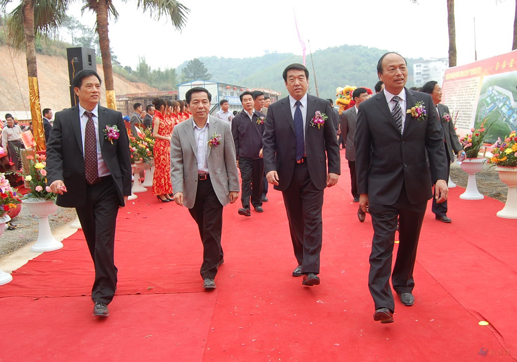 中共梧州市委書記劉志勇(右二)、廣西區(qū)工信委副主任潘峰(左二)于2010年3月31日在廣西梧州松脂股份有限公司歧化擴(kuò)產(chǎn)技改投產(chǎn)慶典儀式上與公司董事長孔仕才(右一)總經(jīng)理車乾池(左一)在一起。