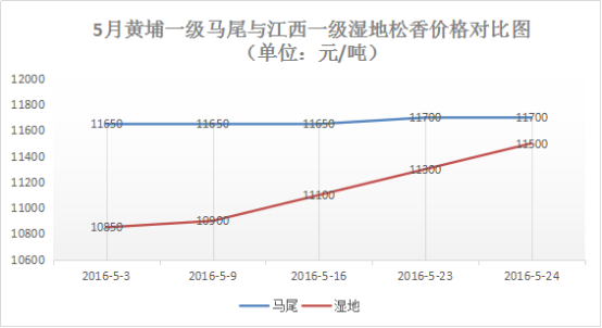 自五月伊始,江西濕地松松香就顯示出上漲的勢頭,截至5月31日,濕地一級松香報價已至11400-11500元/噸,較月初漲了500-600元/噸,且在工廠看漲后市的情況下,或還有一定的上漲空間。