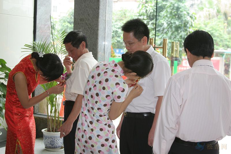 工作人員認(rèn)真地給嘉賓佩戴胸花