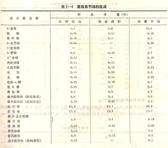 1980年,中國(guó)林業(yè)科學(xué)研究院林產(chǎn)化學(xué)工業(yè)研究所采用氣相色譜儀與氣一質(zhì)聯(lián)用儀對(duì)馬尾松松脂中重級(jí)松節(jié)油(松脂水蒸汽蒸餾180—200℃的餾份)的組成進(jìn)行了研究。油樣取自工廠,分析的結(jié)果列于表2—4。