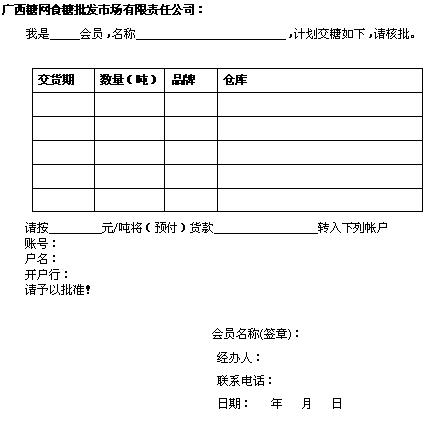 由于我方原因致使我方在特定條件下未能及時(shí)按照《松香預(yù)售合同》第四條有關(guān)規(guī)定通過(guò)貴公司松香電子交易系統(tǒng)進(jìn)行食糖銷售,因此,特委托貴公司通過(guò)我方 會(huì)員號(hào)進(jìn)行代理操作,該操作視同我方交易。我方承諾按照市場(chǎng)《交易規(guī)則》對(duì)此交易行為履行全部職責(zé)并承擔(dān)全部?jī)r(jià)格風(fēng)險(xiǎn)。