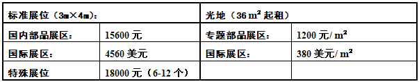 注:⒈標(biāo)準(zhǔn)展位包括如下設(shè)施:三面(或兩面)展板、一張洽談桌、兩把洽談椅、普通照明、一個(gè)220V/5A電源插座、展位內(nèi)鋪地毯、楣板文字(公司名稱(chēng))制作。