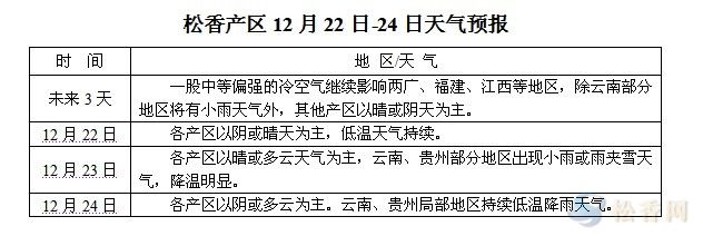 華訊松香網(wǎng)提醒:未來三天,各產(chǎn)區(qū)以晴或多云天氣為主,云南、貴州局部地區(qū)將出現(xiàn)降溫降雨。兩廣地區(qū)晴好天氣,利于最后一批松脂的采收。