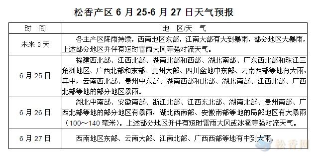華訊松香網(wǎng)提醒:未來三天各產(chǎn)區(qū)降雨天氣持續(xù),部分地區(qū)強(qiáng)度略有趨弱,但總體未有明顯改觀。近期降雨天氣過于頻繁,端午期間粵桂贛等局地強(qiáng)降水造成的了較嚴(yán)重的洪澇災(zāi)害,受災(zāi)地區(qū)松脂采割及運(yùn)輸工作將中斷一段時間。從目前天氣情況看,松脂短時間內(nèi)放量的可能性不大,且部分地區(qū)工廠或因脂量偏少略上調(diào)脂價以保證原料供應(yīng)。