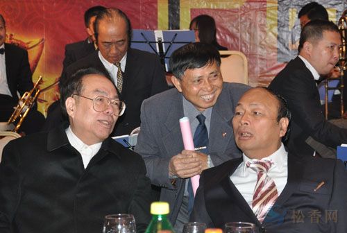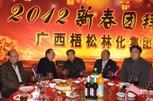 原自治區(qū)人民政府副主席雷宇(左二)與中共梧州市委書記劉志勇(左三)在團拜會上握手致意,左為自治區(qū)人民政府駐廣州辦事處主任徐勵明;右前為中共梧州市委常委、組織部長譚丕創(chuàng);右三為董事長孔仕才;右一為總經(jīng)理車乾池。